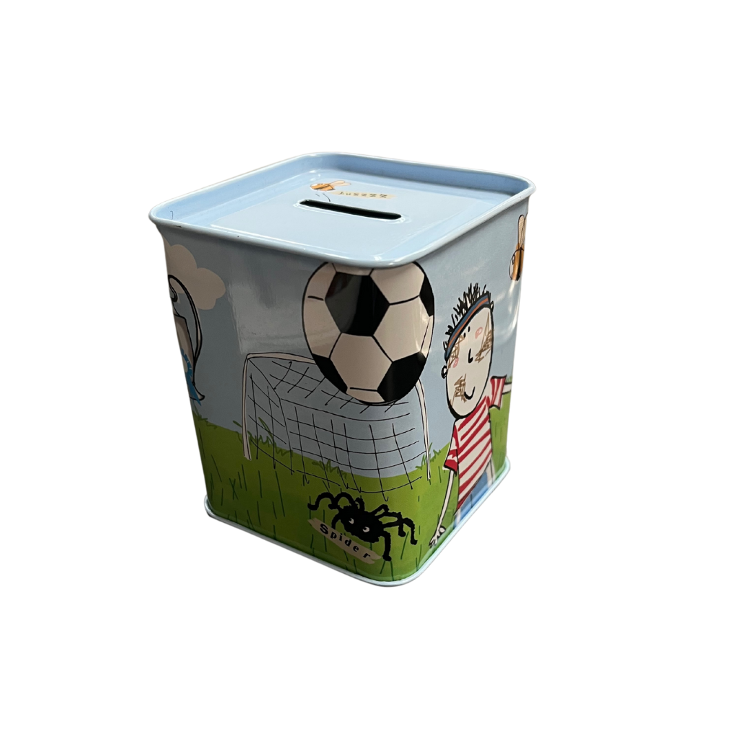 The money box has a secure metal cap closing the opening underneath, to keep littlies safe from swallowing coins.