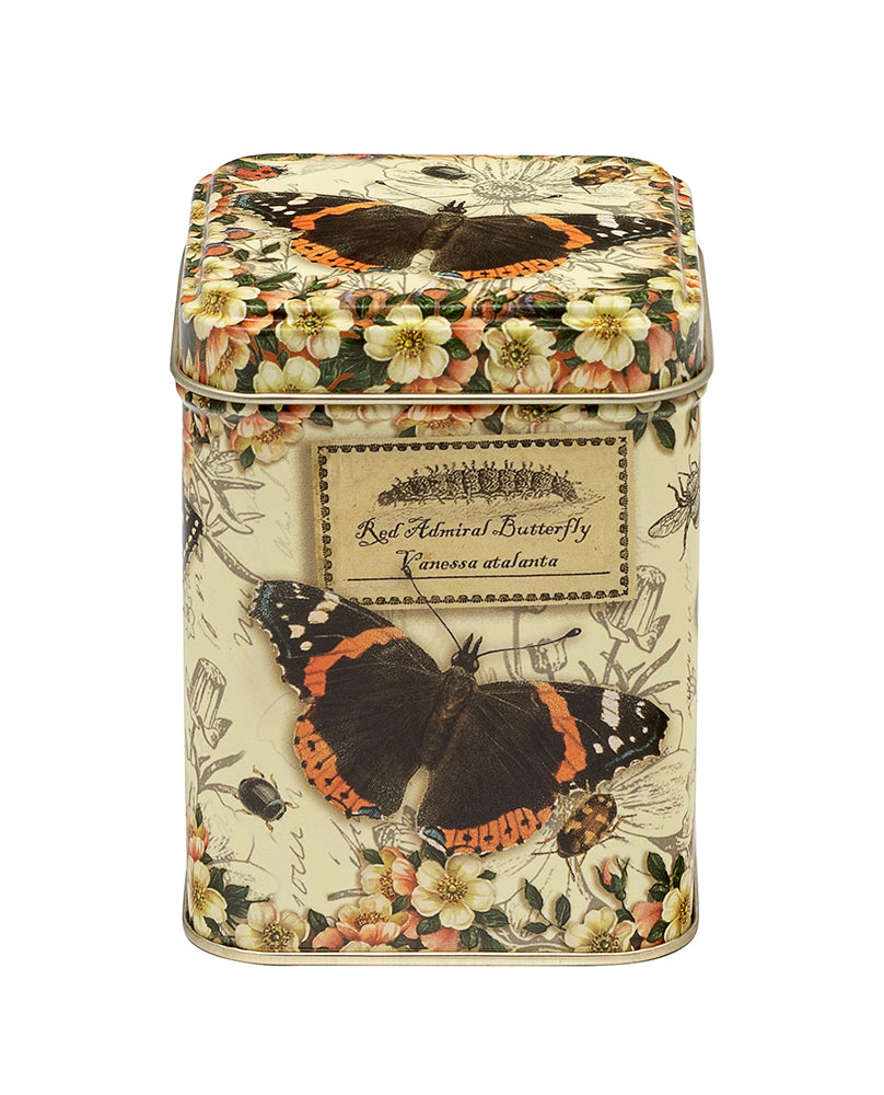 Beautiful butterfly tin showcasing the Peacock Butterfly and the Red Admiral Butterfly, surrounded by flowers, bugs and bees